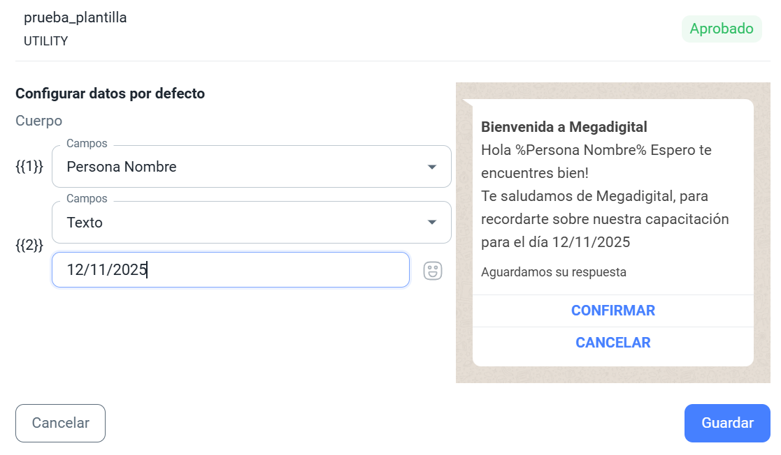 Formato: Las variables se representan como {{1}}, {{2}}, etc., donde el número depende de la cantidad de variables en la plantilla.