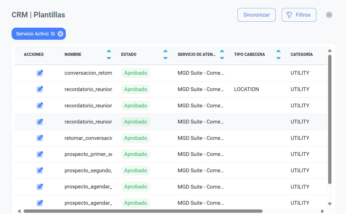 💡 Importante: En este apartado se mostrarán todas las plantillas creadas en Meta que han sido sincronizadas con el sistema.